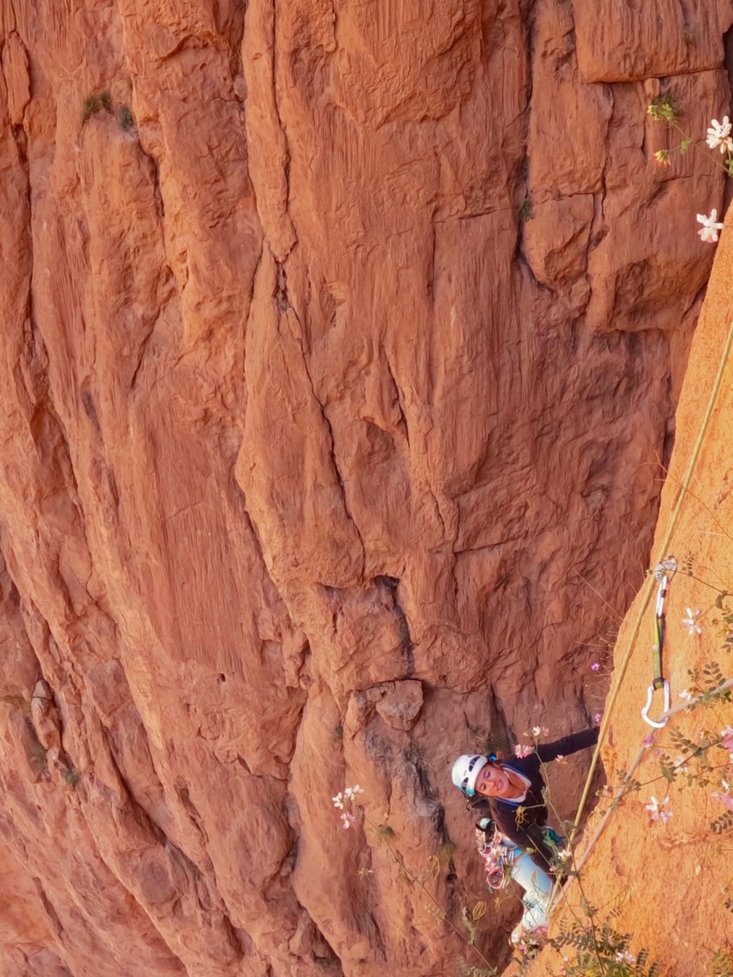 J'en profite pour photographier la mannequin rattachée à l'autre bout de la corde. Les marques de parfum n'ont qu'à bien se tenir ! Elles ne pourront pas rivaliser avec nos clichés. Caillou orangé, ciel bleu azur, fleurs printanières et surtout... Mensurations parfaites de la grimpeuse ! On pourrait également mentionner sa coiffure inégalable (même en passant entre les mains des meilleurs coiffeurs français) ou encore son look à la pointe de la modernité !